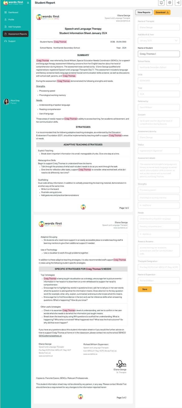In our custom software development project for Words First, we designed a report writing tool specifically to empower speech and language therapists. This initiative focused on building a user-friendly platform that simplified the assessment and reporting processes, enabling therapists to manage client information and create detailed reports with ease. By incorporating innovative features, we enhanced collaboration among colleagues and improved overall client outcomes. Our use of technology fostered a more efficient therapeutic environment tailored to the needs of speech and language professionals. The primary goal of the Words First project was to boost the efficiency and effectiveness of therapists by streamlining documentation through smart templates and automated data entry.
